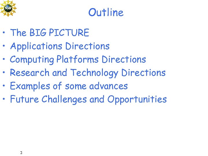 Outline • • • The BIG PICTURE Applications Directions Computing Platforms Directions Research and Technology Directions Examples of some advances Future Challenges and Opportunities 2