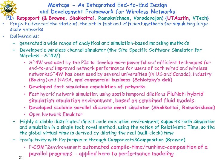 Montage - An Integrated End-to-End Design and Development Framework for Wireless Networks • • PI: Rappaport (& Browne, Shakkottai, Ramakrishnan, Varadarajan) {UTAustin, VTech} Project advanced the state-of-the art in fast and efficient methods for simulating largescale networks Deliverables: – generated a wide range of analytical and simulation-based modeling methods – Developed a wireless channel simulator (the Site Specific Software Simulator for Wireless - S^4 W) • S^4 W was used by the PIs to develop more powerful and efficient techniques for end-to-end improved network performance for users of both wired and wireless networks. S^4 W has been used by several universities (in US and Canada), industry (Boeing) and NASA, and commercial business (Schlotzky’s deli) • Developed fast simulation capabilities of networks • Fast hybrid network simulation using spatiotemporal dilations Flu. Net: hybrid simulation-emulation environment, based on combined fluid models • Developed scalable parallel discrete event simulator (Shakkottai, Ramakrishnan) • Open Network Emulator – Highly scalable distributed direct code execution environment; supports both simulation and emulation in a single tool; novel method, using the notion of Relativistic Time, so that the global virtual time is derived by dilating the real (wall-clock) time – Productivity with Performance through Components&Composition (Browne) • P-COM^2 environement: automated compile-time/runtime-composition of a 21 parallel programs - applied here to performance modeling