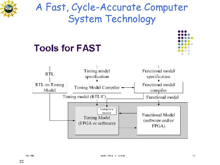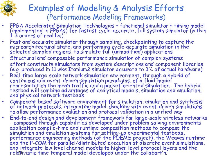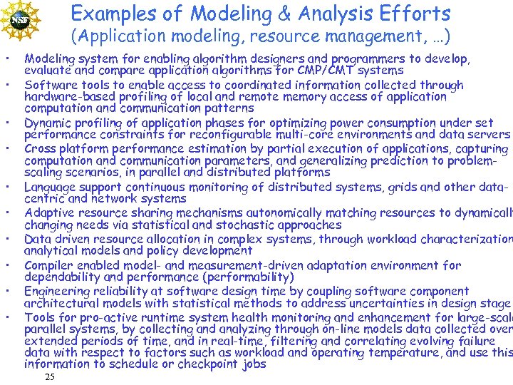 Examples of Modeling & Analysis Efforts • • • (Performance Modeling Frameworks) FPGA Accelerated Simulation Technologies – functional simulator + timing model (implemented in FPGAs) for fastest cycle-accurate, full system simulator (within 1 -3 orders of real hw) Fast and accurate simulator through sampling, checkpointing to capture the microarchitectural state, and performing cycle-accurate simulation in the selected sampled regions, to simulate full (unmodified) applications Structural and composable performance simulation of complex systems effort constructs simulators from system descriptions and component libraries (e. g. produced in 11 wks Itanium 2 simulator accurate to 3% of actual hardware) Real-time large-scale network simulation environment, through a hybrid of continuous and event-driven simulation paradigms, of a fluid-model representation the mean traffic and a packet-oriented simulation. The hybrid testbed will combine advantages of analytical models, simulation and emulation, and physical network testbeds. Component based software environment for simulation, emulation and synthesis of network protocols, integrating model-checking with event-driven simulations to allow performance evaluation and protocol validation in a unified way End-to-end design and development framework for large-scale wireless networks - composed through capabilities developed under problem solving environments application compile-time and runtime composition methods to compose the simulation and emulation systems for setting-up experimental testbeds, performance engineering methods (of the POEMS project), the Weaves runtime and the P-COM for parallel/distributed execution of discrete event simulations, and integrate low level channel models to higher level protocol layers and the 24 relativistic time temporal model developed under the collabort’n.