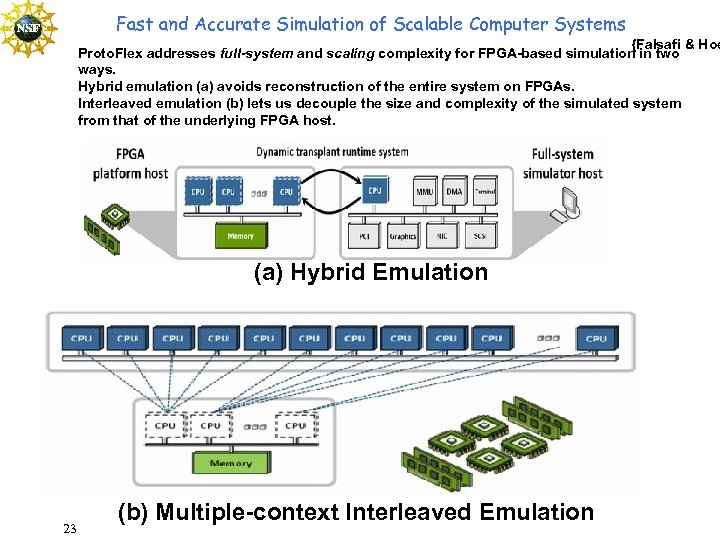 Fast and Accurate Simulation of Scalable Computer Systems {Falsafi & Hoe Proto. Flex addresses full-system and scaling complexity for FPGA-based simulation in two ways. Hybrid emulation (a) avoids reconstruction of the entire system on FPGAs. Interleaved emulation (b) lets us decouple the size and complexity of the simulated system from that of the underlying FPGA host. (a) Hybrid Emulation 23 (b) Multiple-context Interleaved Emulation