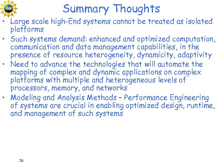 Examples of Modeling & Analysis Efforts (Application modeling, resource management, …) • • • Modeling system for enabling algorithm designers and programmers to develop, evaluate and compare application algorithms for CMP/CMT systems Software tools to enable access to coordinated information collected through hardware-based profiling of local and remote memory access of application computation and communication patterns Dynamic profiling of application phases for optimizing power consumption under set performance constraints for reconfigurable multi-core environments and data servers Cross platform performance estimation by partial execution of applications, capturing computation and communication parameters, and generalizing prediction to problemscaling scenarios, in parallel and distributed platforms Language support continuous monitoring of distributed systems, grids and other datacentric and network systems Adaptive resource sharing mechanisms autonomically matching resources to dynamically changing needs via statistical and stochastic approaches Data driven resource allocation in complex systems, through workload characterization analytical models and policy development Compiler enabled model- and measurement-driven adaptation environment for dependability and performance (performability) Engineering reliability at software design time by coupling software component architectural models with statistical methods to address uncertainties in design stage Tools for pro-active runtime system health monitoring and enhancement for large-scale parallel systems, by collecting and analyzing through on-line models data collected over extended periods of time, and in real-time, filtering and correlating evolving failure data with respect to factors such as workload and operating temperature, and use this information to schedule or checkpoint jobs 25