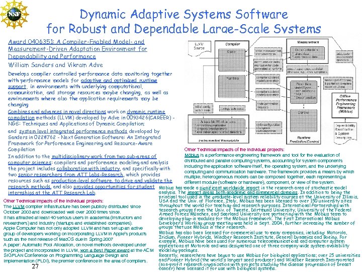 Summary Thoughts • Large scale high-End systems cannot be treated as isolated platforms • Such systems demand: enhanced and optimized computation, communication and data management capabilities, in the presence of resource heterogeneity, dynamicity, adaptivity • Need to advance the technologies that will automate the mapping of complex and dynamic applications on complex platforms with multiple and heterogeneous levels of processors, memory, and networks • Modeling and Analysis Methods – Performance Engineering of systems are crucial in enabling optimized design, runtime, and management of such systems 26
