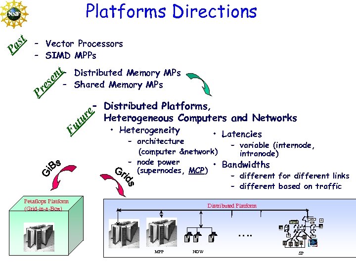 – Vector Processors – SIMD MPPs – Distributed Memory MPs – Shared Memory MPs t en es – Distributed Platforms, Heterogeneous Computers and Networks Fu tu r e Pr Pa st Platforms Directions • Heterogeneity • Latencies – architecture – variable (internode, (computer &network) intranode) – node power • Bandwidths (supernodes, MCP) – different for different links – different based on traffic Petaflops Platform (Grid-in-a-Box) Distributed Platform tac-com alg accelerator …. MPP NOW fire cntl data base fire cntl SAR SP