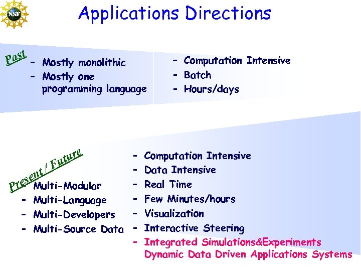 Applications Directions ast – Mostly monolithic P – Mostly one programming language ure ut – – t/F n e – res Multi-Modular P– – – Multi-Language – – Multi-Developers – Multi-Source Data – – – Computation Intensive – Batch – Hours/days Computation Intensive Data Intensive Real Time Few Minutes/hours Visualization Interactive Steering Integrated Simulations&Experiments Dynamic Data Driven Applications Systems