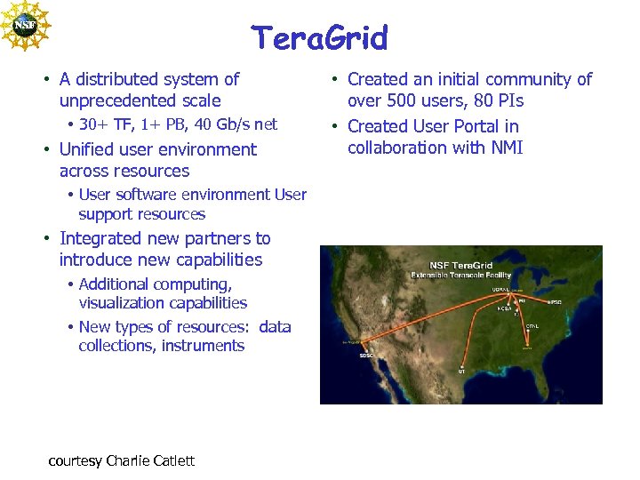 Tera. Grid • A distributed system of unprecedented scale • 30+ TF, 1+ PB, 40 Gb/s net • Unified user environment across resources • User software environment User support resources • Integrated new partners to introduce new capabilities • Additional computing, visualization capabilities • New types of resources: data collections, instruments courtesy Charlie Catlett • Created an initial community of over 500 users, 80 PIs • Created User Portal in collaboration with NMI