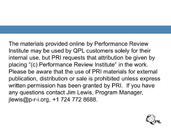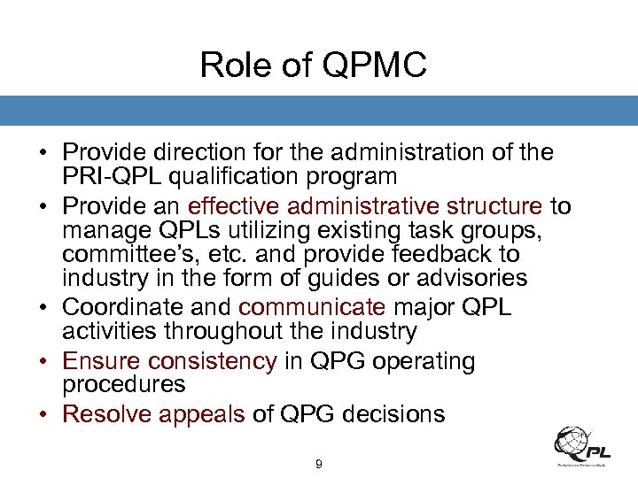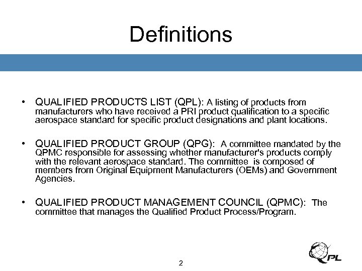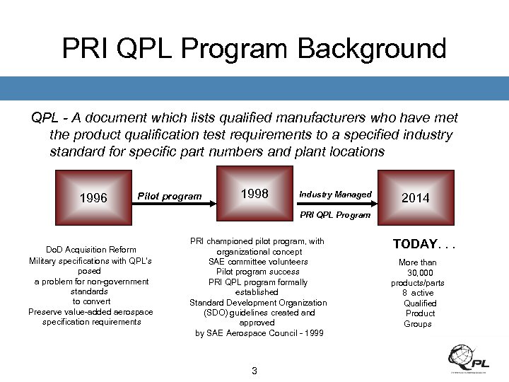 Definitions • QUALIFIED PRODUCTS LIST (QPL): A listing of products from manufacturers who have received a PRI product qualification to a specific aerospace standard for specific product designations and plant locations. • QUALIFIED PRODUCT GROUP (QPG): A committee mandated by the QPMC responsible for assessing whether manufacturer's products comply with the relevant aerospace standard. The committee is composed of members from Original Equipment Manufacturers (OEMs) and Government Agencies. • QUALIFIED PRODUCT MANAGEMENT COUNCIL (QPMC): The committee that manages the Qualified Product Process/Program. 2