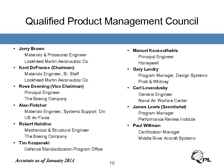 Qualified Product Management Council • Jerry Brown Materials & Processes Engineer Lockheed Martin Aeronautics Co. • Kent De. Franco (Chairman) Materials Engineer, Sr. Staff Lockheed Martin Aeronautics Co. • Ross Downing (Vice Chairman) Principal Engineer The Boeing Company • Alan Fletcher Materials Engineer, Systems Support Div. US Air Force • Robert Hainline Mechanical & Structural Engineer The Boeing Company • Tim Koczanski Defense Standardization Program Office Accurate as of January 2014 • Manuel Koucouthakis Principal Engineer Honeywell • Gary Landry Program Manager, Design Systems Pratt & Whitney • Carl Levandusky General Engineer Naval Air Warfare Center • James Lewis (Secretariat) Program Manager Performance Review Institute • Paul Wittman Certification Manager Middle River Aircraft Systems 10