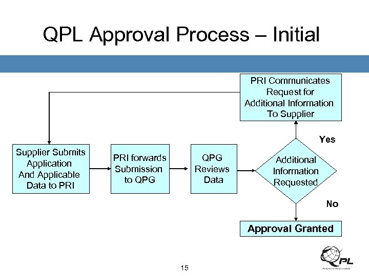 QPL Approval Process – Initial PRI Communicates Request for Additional Information To Supplier Yes Supplier Submits Application And Applicable Data to PRI forwards Submission to QPG Reviews Data Additional Information Requested No Approval Granted 15