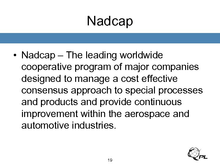 Nadcap • Nadcap – The leading worldwide cooperative program of major companies designed to manage a cost effective consensus approach to special processes and products and provide continuous improvement within the aerospace and automotive industries. 19