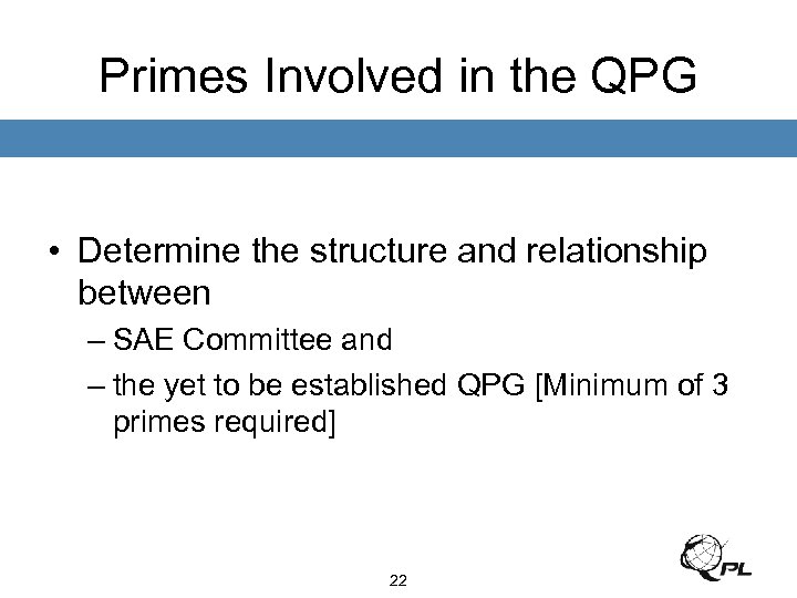 Primes Involved in the QPG • Determine the structure and relationship between – SAE Committee and – the yet to be established QPG [Minimum of 3 primes required] 22