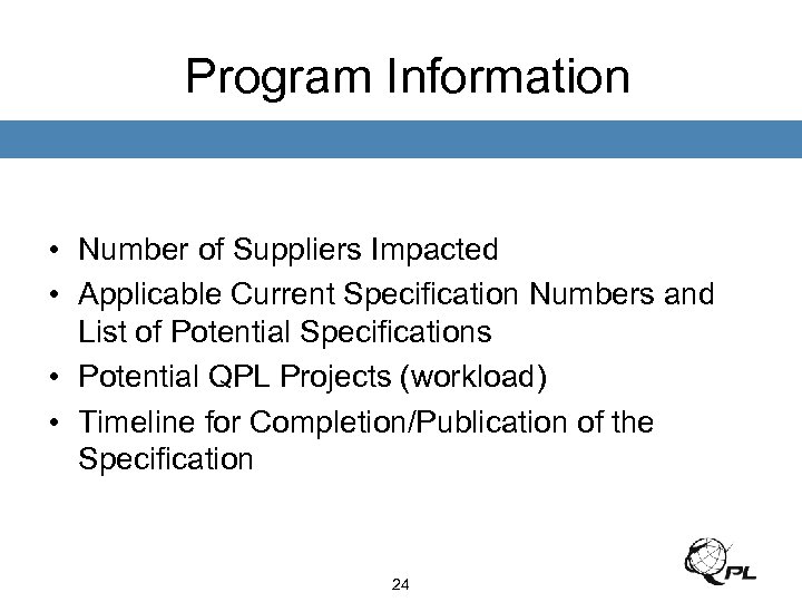 Program Information • Number of Suppliers Impacted • Applicable Current Specification Numbers and List of Potential Specifications • Potential QPL Projects (workload) • Timeline for Completion/Publication of the Specification 24