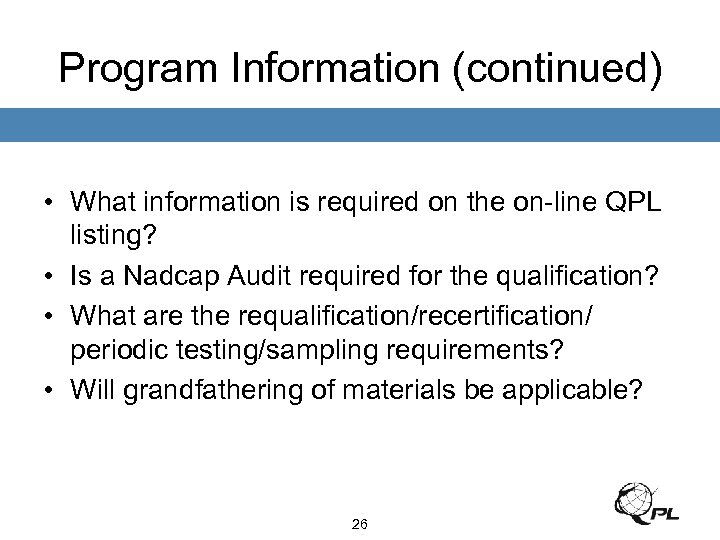 Program Information (continued) • Is an AS/EN/JISQ 9100 approved quality system required? • Is it required to conduct the testing at an ISO/IEC 17025 accredited laboratory with applicable scope? 25
