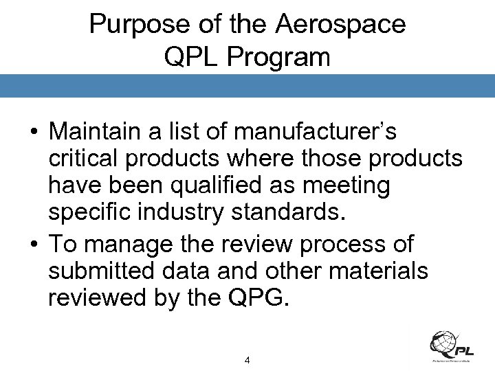 PRI QPL Program Background QPL - A document which lists qualified manufacturers who have met the product qualification test requirements to a specified industry standard for specific part numbers and plant locations 1996 Pilot program 1998 Industry Managed 2014 PRI QPL Program Do. D Acquisition Reform Military specifications with QPL’s posed a problem for non-government standards to convert Preserve value-added aerospace specification requirements PRI championed pilot program, with organizational concept SAE committee volunteers Pilot program success PRI QPL program formally established Standard Development Organization (SDO) guidelines created and approved by SAE Aerospace Council - 1999 3 TODAY. . . More than 30, 000 products/parts 8 active Qualified Product Groups