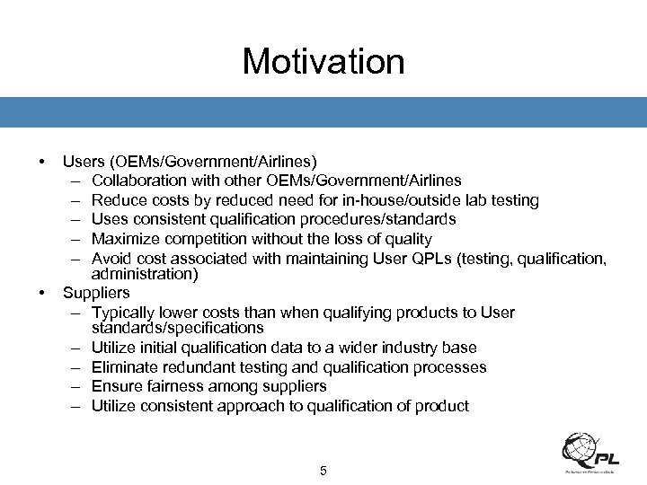 Purpose of the Aerospace QPL Program • Maintain a list of manufacturer’s critical products where those products have been qualified as meeting specific industry standards. • To manage the review process of submitted data and other materials reviewed by the QPG. 4