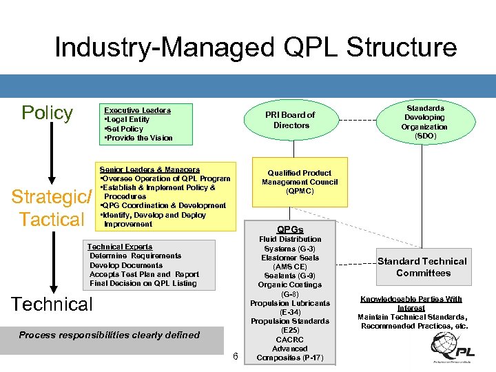 Motivation • • Users (OEMs/Government/Airlines) – Collaboration with other OEMs/Government/Airlines – Reduce costs by reduced need for in-house/outside lab testing – Uses consistent qualification procedures/standards – Maximize competition without the loss of quality – Avoid cost associated with maintaining User QPLs (testing, qualification, administration) Suppliers – Typically lower costs than when qualifying products to User standards/specifications – Utilize initial qualification data to a wider industry base – Eliminate redundant testing and qualification processes – Ensure fairness among suppliers – Utilize consistent approach to qualification of product 5