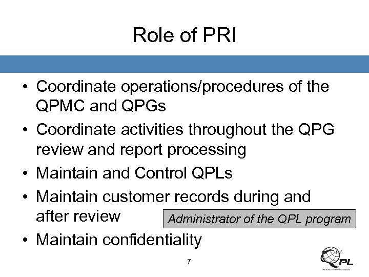 Industry-Managed QPL Structure Policy Executive Leaders • Legal Entity • Set Policy • Provide the Vision Strategic/ Tactical PRI Board of Directors Senior Leaders & Managers • Oversee Operation of QPL Program • Establish & Implement Policy & Procedures • QPG Coordination & Development • Identify, Develop and Deploy Improvement Standards Developing Organization (SDO) Qualified Product Management Council (QPMC) QPGs Technical Experts Determine Requirements Develop Documents Accepts Test Plan and Report Final Decision on QPL Listing Technical Process responsibilities clearly defined 6 Fluid Distribution Systems (G-3) Elastomer Seals (AMS CE) Sealants (G-9) Organic Coatings (G-8) Propulsion Lubricants (E-34) Propulsion Standards (E 25) CACRC Advanced Composites (P-17) Standard Technical Committees Knowledgeable Parties With Interest Maintain Technical Standards, Recommended Practices, etc.