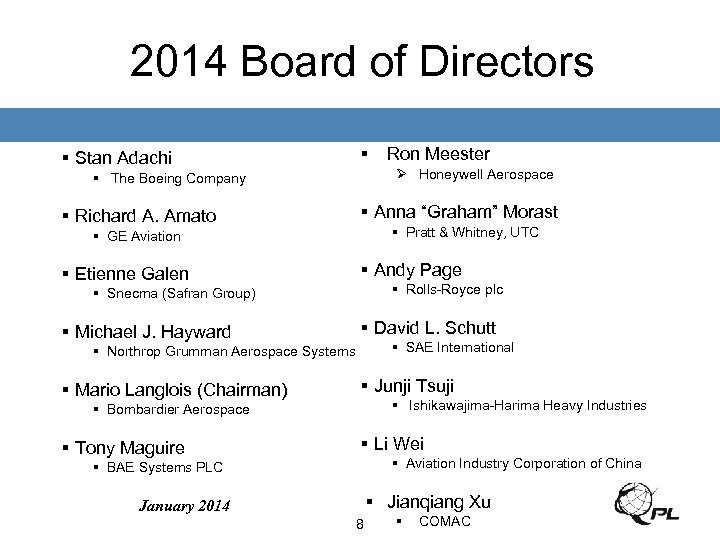 2014 Board of Directors § Stan Adachi § Ø Honeywell Aerospace § The Boeing Company § Richard A. Amato § Anna “Graham” Morast § Pratt & Whitney, UTC § GE Aviation § Etienne Galen § Andy Page § Rolls-Royce plc § Snecma (Safran Group) § Michael J. Hayward § David L. Schutt § SAE International § Northrop Grumman Aerospace Systems § Mario Langlois (Chairman) § Junji Tsuji § Ishikawajima-Harima Heavy Industries § Bombardier Aerospace § Tony Maguire Ron Meester § Li Wei § Aviation Industry Corporation of China § BAE Systems PLC § Jianqiang Xu January 2014 8 § COMAC