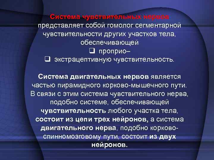 Система чувствительных нервов представляет собой гомолог сегментарной чувствительности других участков тела, обеспечивающей q проприо– q экстрацептивную чувствительность. Система двигательных нервов является частью пирамидного корково мышечного пути. В связи с этим система чувствительного нерва, подобно системе, обеспечивающей чувствительность любого участка тела, состоит из цепи трех нейронов, а система двигательного нерва, подобно корково спинномозговому пути, состоит из двух нейронов.