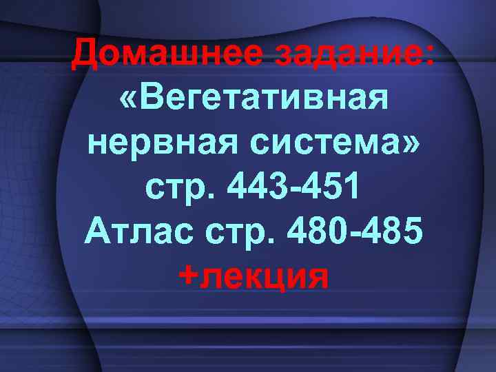 Домашнее задание: «Вегетативная нервная система» стр. 443 451 Атлас стр. 480 485 +лекция