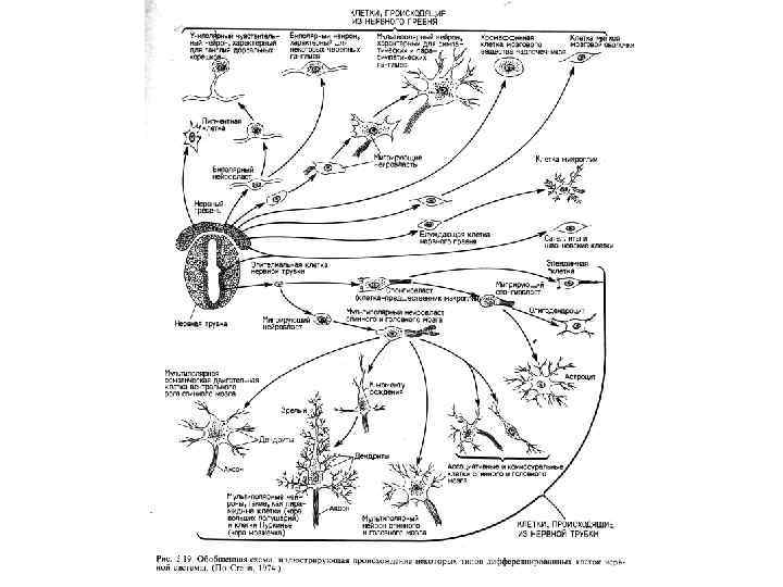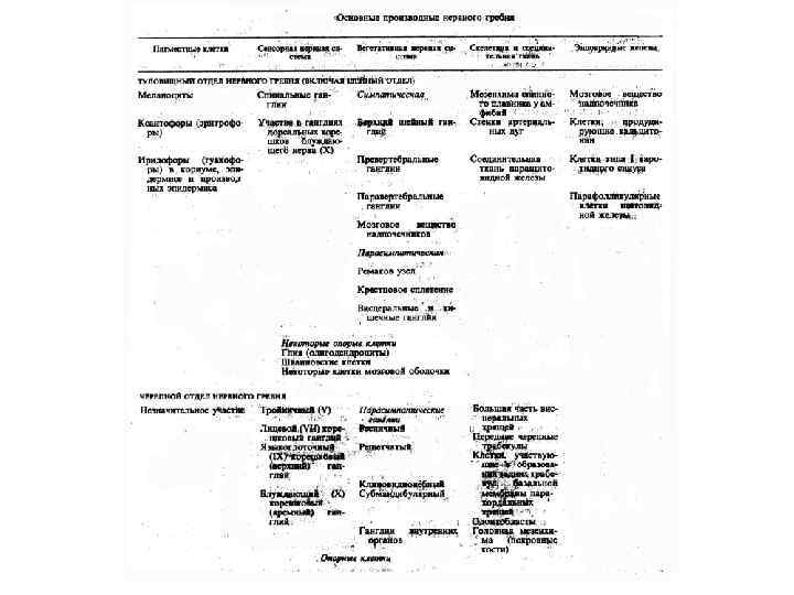 Рис 13. 1. Клетки нервного гребня в краниальном отделе мигрируют в жаберные дуги и лицевой отдел и формируют кости и хрящи лица и шеи. Они образуют также пигментные клетки и черепные нервы. Шейный (сомиты 1 -7) и крестцовый (после сомита 28) отделы материала нервного гребня образуют парасиматические нервы кишечника. Клетки нервного гребня на уровне сомитов 1 -3 образуют производные в области сердца. Клетки нервного гребня туловища (сомиты 7 и далее) образуют симпатические ганглии и ганглии дорсальных корешков. Часть из них (сомиты 18 -24) дают клетки коры надпочечников.