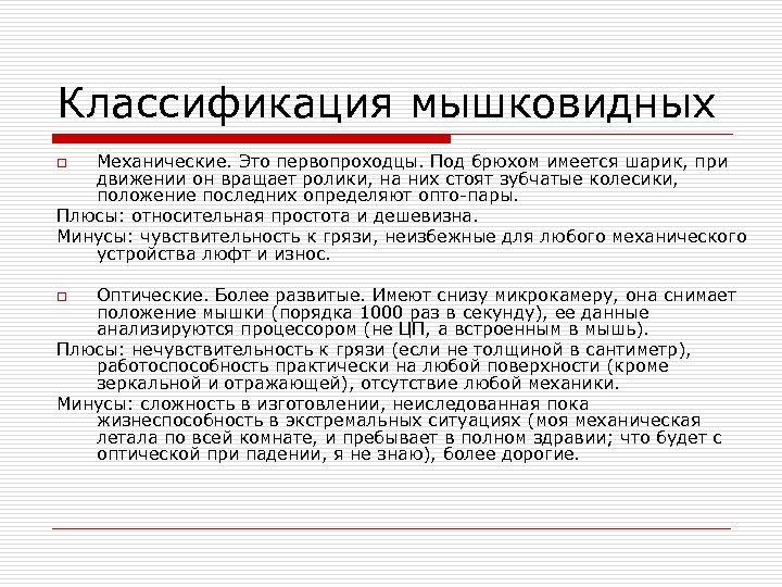 Классификация мышковидных Механические. Это первопроходцы. Под брюхом имеется шарик, при движении он вращает ролики, на них стоят зубчатые колесики, положение последних определяют опто-пары. Плюсы: относительная простота и дешевизна. Минусы: чувствительность к грязи, неизбежные для любого механического устройства люфт и износ. o Оптические. Более развитые. Имеют снизу микрокамеру, она снимает положение мышки (порядка 1000 раз в секунду), ее данные анализируются процессором (не ЦП, а встроенным в мышь). Плюсы: нечувствительность к грязи (если не толщиной в сантиметр), работоспособность практически на любой поверхности (кроме зеркальной и отражающей), отсутствие любой механики. Минусы: сложность в изготовлении, неиследованная пока жизнеспособность в экстремальных ситуациях (моя механическая летала по всей комнате, и пребывает в полном здравии; что будет с оптической при падении, я не знаю), более дорогие. o