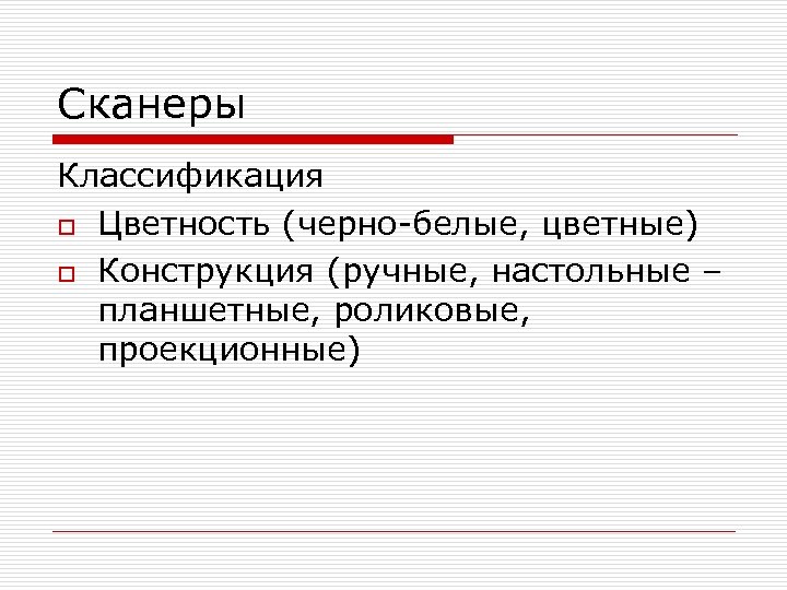Сканеры Классификация o Цветность (черно-белые, цветные) o Конструкция (ручные, настольные – планшетные, роликовые, проекционные)