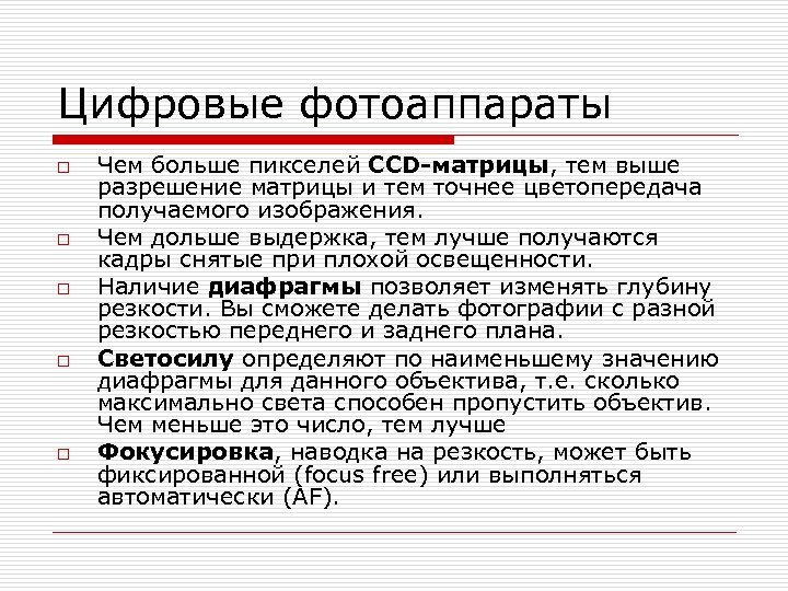 Цифровые фотоаппараты o o o Чем больше пикселей CCD-матрицы, тем выше разрешение матрицы и тем точнее цветопередача получаемого изображения. Чем дольше выдержка, тем лучше получаются кадры снятые при плохой освещенности. Наличие диафрагмы позволяет изменять глубину резкости. Вы сможете делать фотографии с разной резкостью переднего и заднего плана. Светосилу определяют по наименьшему значению диафрагмы для данного объектива, т. е. сколько максимально света способен пропустить объектив. Чем меньше это число, тем лучше Фокусировка, наводка на резкость, может быть фиксированной (focus free) или выполняться автоматически (AF).