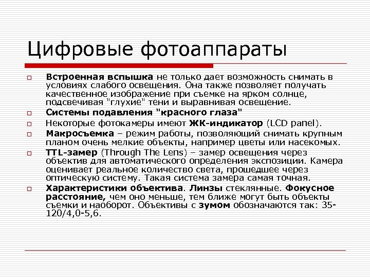 Цифровые фотоаппараты o o o Встроенная вспышка не только дает возможность снимать в условиях слабого освещения. Она также позволяет получать качественное изображение при съемке на ярком солнце, подсвечивая "глухие" тени и выравнивая освещение. Системы подавления "красного глаза" Некоторые фотокамеры имеют ЖК-индикатор (LCD panel). Макросъемка – режим работы, позволяющий снимать крупным планом очень мелкие объекты, например цветы или насекомых. TTL-замер (Through The Lens) – замер освещения через объектив для автоматического определения экспозиции. Камера оценивает реальное количество света, прошедшее через оптическую систему. Такая система замера самая точная. Характеристики объектива. Линзы стеклянные. Фокусное расстояние, чем оно меньше, тем ближе могут быть объекты съемки и наоборот. Объективы с зумом обозначаются так: 35120/4, 0 -5, 6.