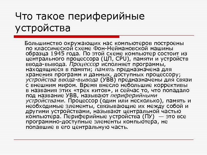 Что такое периферийные устройства Большинство окружающих нас компьютеров построены по классической схеме Фон-Неймановской машины образца 1945 года. По этой схеме компьютер состоит из центрального процессора (ЦП, CPU), памяти и устройств ввода-вывода. Процессор исполняет программы, находящиеся в памяти; память предназначена для хранения программ и данных, доступных процессору; устройства ввода-вывода (УВВ) предназначены для связи с внешним миром. Время внесло небольшие коррективы в названия этих «трех китов» , и сейчас то, что попадало под название УВВ, называют периферийными устройствами. Процессор (один или несколько), память и необходимые элементы, связывающие их между собой и другими устройствами, называют центральной частью компьютера. Периферийные устройства (ПУ) — это все программно-доступные элементы компьютера, не попавшие в его центральную часть.