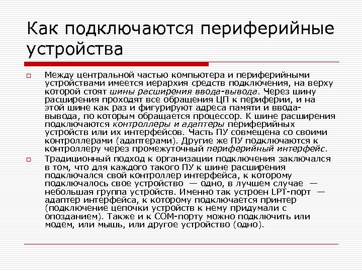 Как подключаются периферийные устройства o o Между центральной частью компьютера и периферийными устройствами имеется иерархия средств подключения, на верху которой стоят шины расширения ввода-вывода. Через шину расширения проходят все обращения ЦП к периферии, и на этой шине как раз и фигурируют адреса памяти и вводавывода, по которым обращается процессор. К шине расширения подключаются контроллеры и адаптеры периферийных устройств или их интерфейсов. Часть ПУ совмещена со своими контроллерами (адаптерами). Другие же ПУ подключаются к контроллеру через промежуточный периферийный интерфейс. Традиционный подход к организации подключения заключался в том, что для каждого такого ПУ к шине расширения подключался свой контроллер интерфейса, к которому подключалось свое устройство — одно, в лучшем случае — небольшая группа устройств. Именно так устроен LPT-порт — адаптер интерфейса, к которому подключается принтер (подключение цепочки устройств к нему придумали с опозданием). Также и к COM-порту можно подключить или модем, или мышь, или другое устройство (одно).