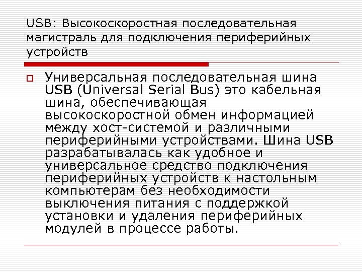 USB: Высокоскоростная последовательная магистраль для подключения периферийных устройств o Универсальная последовательная шина USB (Universal Serial Bus) это кабельная шина, обеспечивающая высокоскоростной обмен информацией между хост-системой и различными периферийными устройствами. Шина USB разрабатывалась как удобное и универсальное средство подключения периферийных устройств к настольным компьютерам без необходимости выключения питания с поддержкой установки и удаления периферийных модулей в процессе работы.