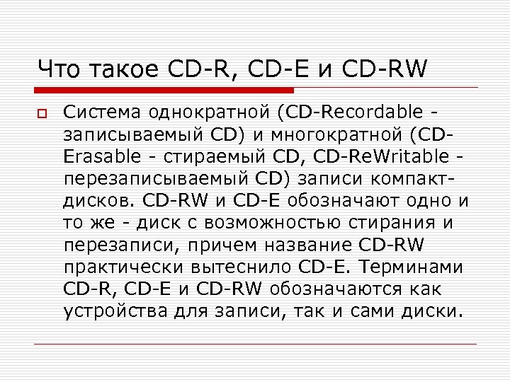 Что такое CD-R, CD-E и CD-RW o Система однократной (CD-Recordable - записываемый CD) и многократной (CDErasable - стираемый CD, CD-Re. Writable - перезаписываемый CD) записи компактдисков. CD-RW и CD-E обозначают одно и то же - диск с возможностью стирания и перезаписи, причем название CD-RW практически вытеснило CD-E. Терминами CD-R, CD-E и CD-RW обозначаются как устройства для записи, так и сами диски.