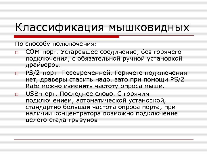 Классификация мышковидных По способу подключения: o COM-порт. Устаревшее соединение, без горячего подключения, с обязательной ручной установкой драйверов. o PS/2 -порт. Посовременней. Горячего подключения нет, драверы ставить надо, зато при помощи PS/2 Rate можно изменять частоту опроса мыши. o USB-порт. Последнее слово. С горячим подключением, автоматической установкой, стандартно большая частота опроса порта, при наличии концентратора возможно подключение целого стада грызунов