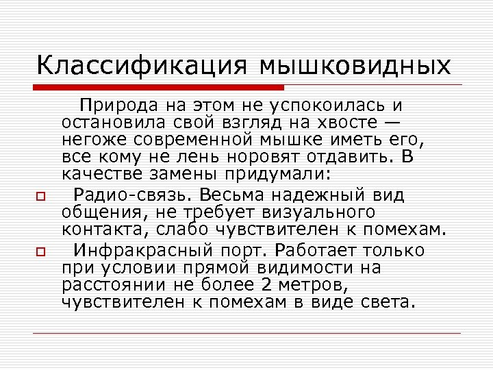 Классификация мышковидных Природа на этом не успокоилась и остановила свой взгляд на хвосте — негоже современной мышке иметь его, все кому не лень норовят отдавить. В качестве замены придумали: o Радио-связь. Весьма надежный вид общения, не требует визуального контакта, слабо чувствителен к помехам. o Инфракрасный порт. Работает только при условии прямой видимости на расстоянии не более 2 метров, чувствителен к помехам в виде света.
