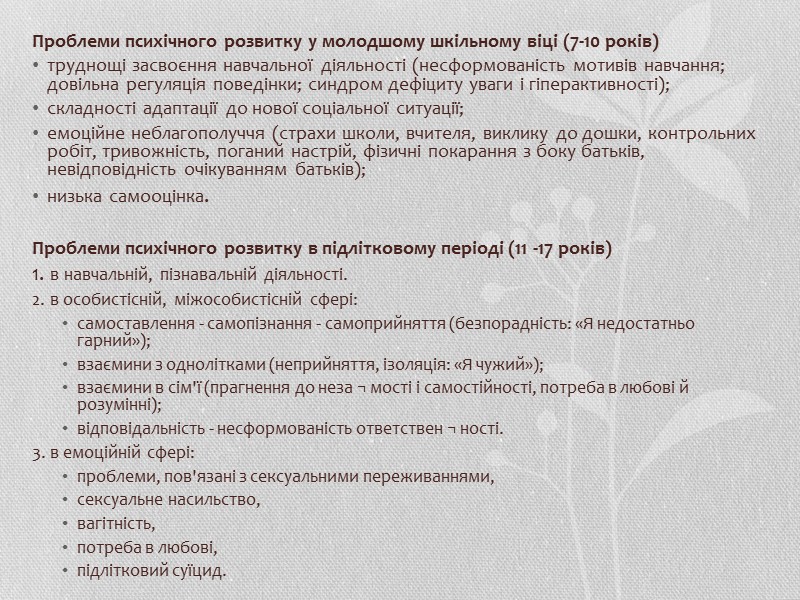 Проблеми психічного розвитку у молодшому шкільному віці (7-10 років) труднощі засвоєння навчальної діяльності (несформованість мотивів навчання; довільна регуляція поведінки; синдром дефіциту уваги і гіперактивності); складності адаптації до нової соціальної ситуації; емоційне неблагополуччя (страхи школи, вчителя, виклику до дошки, контрольних робіт, тривожність, поганий настрій, фізичні покарання з боку батьків, невідповідність очікуванням батьків); низька самооцінка. Проблеми психічного розвитку в підлітковому періоді (11 -17 років) 1. в навчальній, пізнавальній діяльності. 2. в особистісній, міжособистісній сфері: самоставлення - самопізнання - самоприйняття (безпорадність: «Я недостатньо гарний»); взаємини з однолітками (неприйняття, ізоляція: «Я чужий»); взаємини в сім'ї (прагнення до неза ¬ мості і самостійності, потреба в любові й розумінні); відповідальність - несформованість ответствен ¬ ності. 3. в емоційній сфері: проблеми, пов'язані з сексуальними переживаннями, сексуальне насильство, вагітність, потреба в любові, підлітковий суїцид.