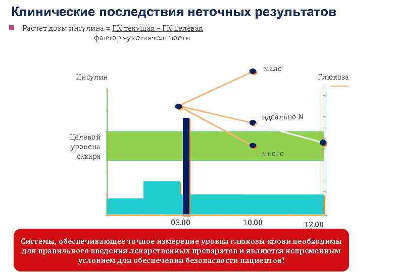Клинические последствия неточных результатов n Расчет дозы инсулина = ГК текущая – ГК целевая фактор чувствительности мало Инсулин Глюкоза идеально N Целевой уровень сахара много 08. 00 10. 00 12. 00 Системы, обеспечивающее точное измерение уровня глюкозы крови необходимы для правильного введения лекарственных препаратов и являются непременным | условием для обеспечения безопасности пациентов!
