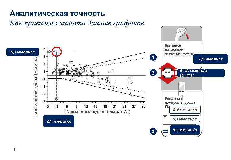 Аналитическая точность Как правильно читать данные графиков Глюкозооксидаза (ммоль/л) 6, 3 ммоль/л 1 2 2, 9 ммоль/л ОШИБКА ∆ 6, 3 ммоль/л (217%) Результат измерения уровня ГК 2, 9 ммоль/л Глюкозооксидаза (ммоль/л) 6, 3 ммоль/л 2, 9 ммоль/л 3 | Истинное начальное значение уровня ГК: 9, 2 ммоль/л