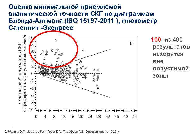 Оценка минимальной приемлемой аналитической точности СКГ по диаграммам Блэнда-Алтмана (ISO 15197 -2011 ), глюкометр Сателлит -Экспресс 100 из 400 результатов находятся вне допустимой зоны | Хайбулина Э. Т, Мамонов Р. А. , Горст К. А. , Тимофеев А. В. Эндокринология б 2014
