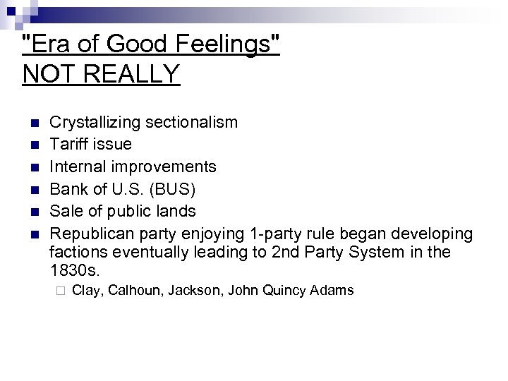 "Era of Good Feelings" NOT REALLY n n n Crystallizing sectionalism Tariff issue Internal improvements Bank of U. S. (BUS) Sale of public lands Republican party enjoying 1 -party rule began developing factions eventually leading to 2 nd Party System in the 1830 s. ¨ Clay, Calhoun, Jackson, John Quincy Adams