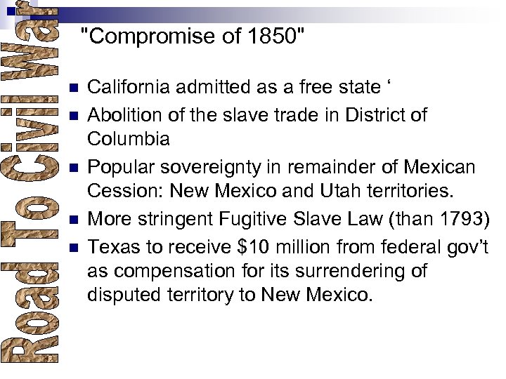 "Compromise of 1850" n n n California admitted as a free state ‘ Abolition of the slave trade in District of Columbia Popular sovereignty in remainder of Mexican Cession: New Mexico and Utah territories. More stringent Fugitive Slave Law (than 1793) Texas to receive $10 million from federal gov’t as compensation for its surrendering of disputed territory to New Mexico.