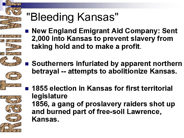 "Bleeding Kansas" n New England Emigrant Aid Company: Sent 2, 000 into Kansas to prevent slavery from taking hold and to make a profit. n Southerners infuriated by apparent northern betrayal -- attempts to abolitionize Kansas. n 1855 election in Kansas for first territorial legislature 1856, a gang of proslavery raiders shot up and burned part of free-soil Lawrence, Kansas.