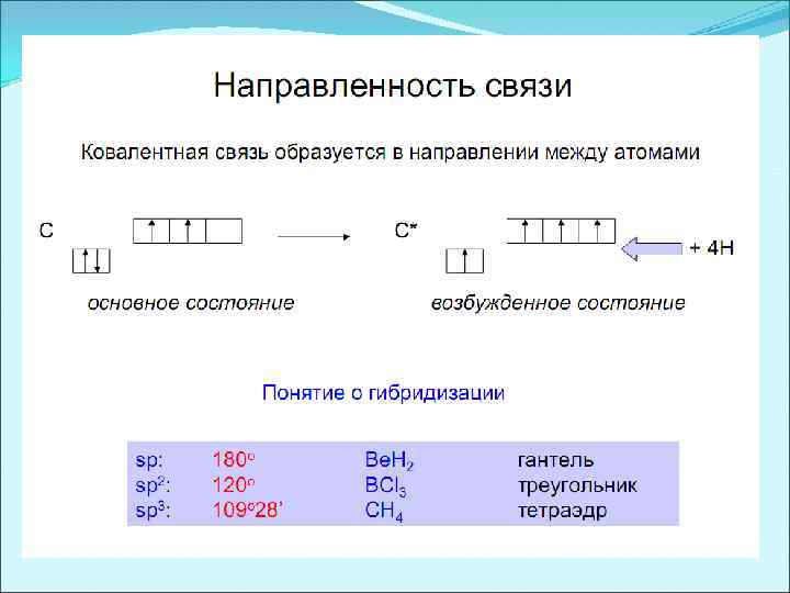 Теория гибридизации По правилу Гунда, в атоме появляется максимальное число неспаренных электронов. Эта гипотеза получила название явления гибридизации, а орбитали, образующиеся в результате усреднения энергий подуровней, называются гибридными В зависимости от того, какие орбитали участвуют в образовании гибридных орбиталей, рассматривают различные типы гибридизации и пространственные конфигурации образовавшихся гибридных орбиталей Число получившихся гибридных орбиталей должно быть равно общему числу орбиталей, вступивших в гибридизацию