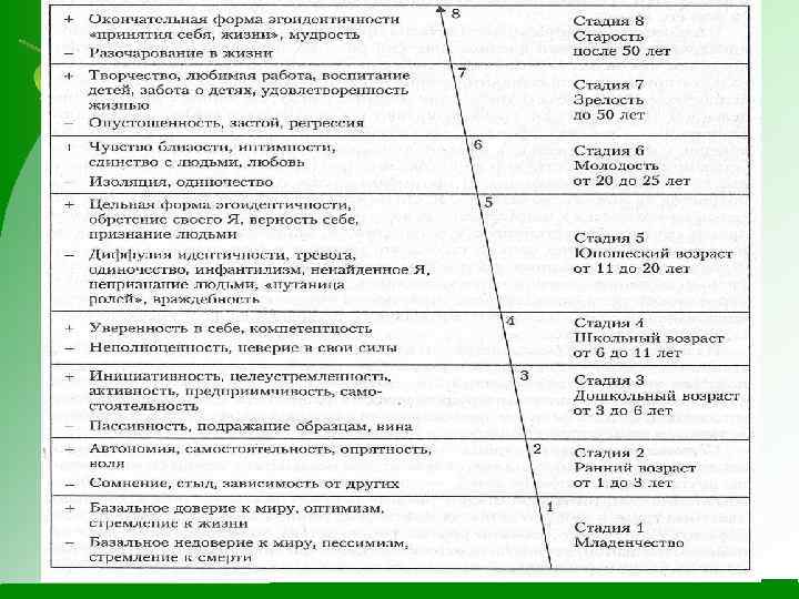 1. первая фаза ( первый год жизни) характеризуется первичным доверием или недоверием ребенка к окружению; 2. вторая фаза (раннее детство: 2— 3 -й годы жизни) характеризуется автономией или стыдом и сомнением; 3. третья фаза (дошкольный возраст: 4— 5 -й годы жизни) характеризуется инициативой или чувством вины; конфликт между предприимчивостью и неадекватностью; 4. четвертая фаза (школьный возраст: с 6 -ти до 11— 12 лет, т. е. до половозрелости) характеризуется чувством ценности и трудолюбия или малоценности; 5. пятая фаза (юношество) характеризуется личностной индивидуальностью, идентичностью или диффузией идентичности; идентификация личности и путаница ролей; 6. шестая фаза (молодость: 20— 30 лет) характеризуется конфликт между близостью и одиночеством; интимностью и солидарностью или изоляцией; 7. седьмая фаза (зрелость: 30— 40 лет) характеризуется творческим началом, интегративностью или застоем; 8. восьмая фаза (старший взрослый возраст (плюс старость): от 40 лет и старше) характеризуется конфликтом цельности и безнадежности. целостностью личности или раздвоенностью и отчаянием.