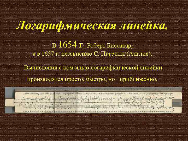 Логарифмическая линейка. В 1654 г. Роберт Биссакар, а в 1657 г. независимо С. Патридж (Англия). Вычисления с помощью логарифмической линейки производятся просто, быстро, но приближенно.