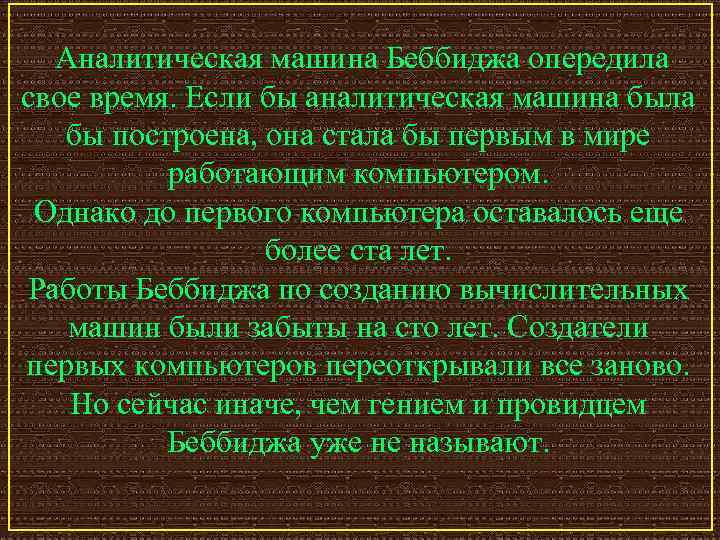 Аналитическая машина Беббиджа опередила свое время. Если бы аналитическая машина была бы построена, она стала бы первым в мире работающим компьютером. Однако до первого компьютера оставалось еще более ста лет. Работы Беббиджа по созданию вычислительных машин были забыты на сто лет. Создатели первых компьютеров переоткрывали все заново. Но сейчас иначе, чем гением и провидцем Беббиджа уже не называют.