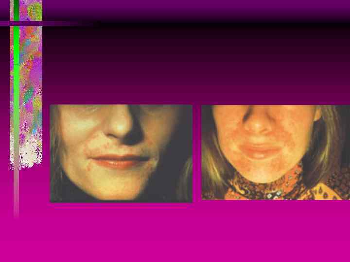 ПРИЧИНЫ РАЗВИТИЯ ПЕРИОРАЛЬНОГО ДЕРМАТИТА • Гормональный дисбаланс (предменструальный, климактерический периоды, прием оральных контрацептивов); • Длительная иммуносупрессивная терапия. • Очаги фокальной инфекции верхних дыхательных путей; • Заболевания желудочно-кишечного тракта, в т. ч. паразитарная инвазия.