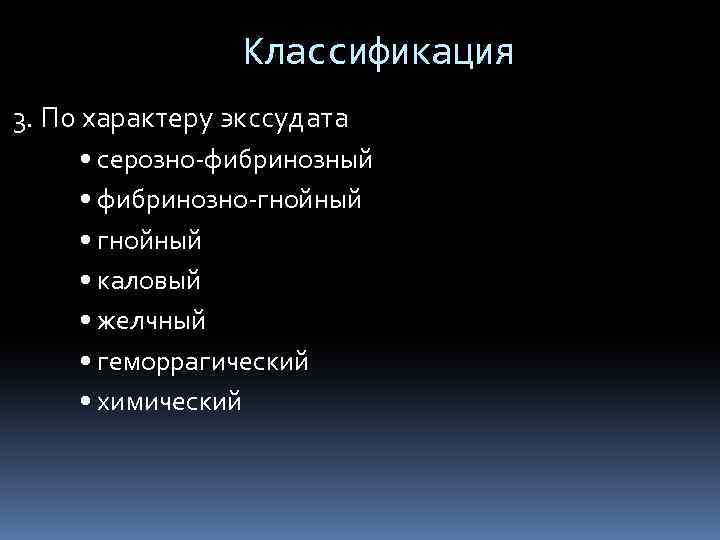 Классификация 3. По характеру экссудата • серозно-фибринозный • фибринозно-гнойный • каловый • желчный • геморрагический • химический