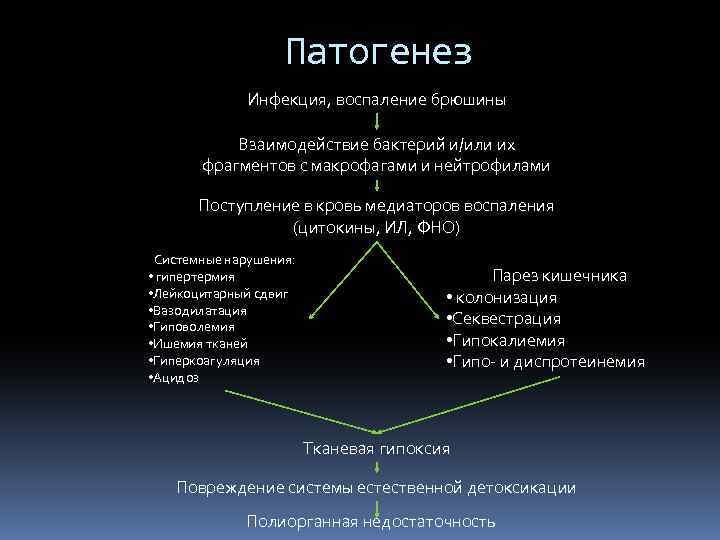 Патогенез Инфекция, воспаление брюшины Взаимодействие бактерий и/или их фрагментов с макрофагами и нейтрофилами Поступление в кровь медиаторов воспаления (цитокины, ИЛ, ФНО) Системные нарушения: • гипертермия • Лейкоцитарный сдвиг • Вазодилатация • Гиповолемия • Ишемия тканей • Гиперкоагуляция • Ацидоз Парез кишечника • колонизация • Секвестрация • Гипокалиемия • Гипо- и диспротеинемия Тканевая гипоксия Повреждение системы естественной детоксикации Полиорганная недостаточность