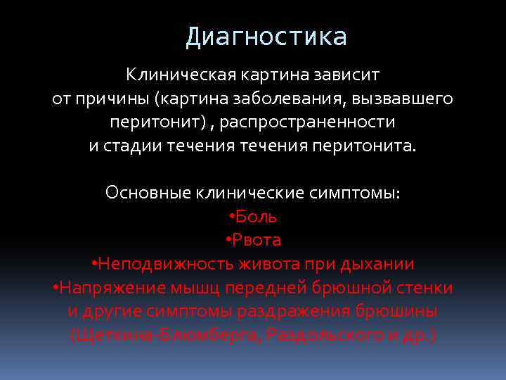 Диагностика Клиническая картина зависит от причины (картина заболевания, вызвавшего перитонит) , распространенности и стадии течения перитонита. Основные клинические симптомы: • Боль • Рвота • Неподвижность живота при дыхании • Напряжение мышц передней брюшной стенки и другие симптомы раздражения брюшины (Щеткина-Блюмберга, Раздольского и др. )
