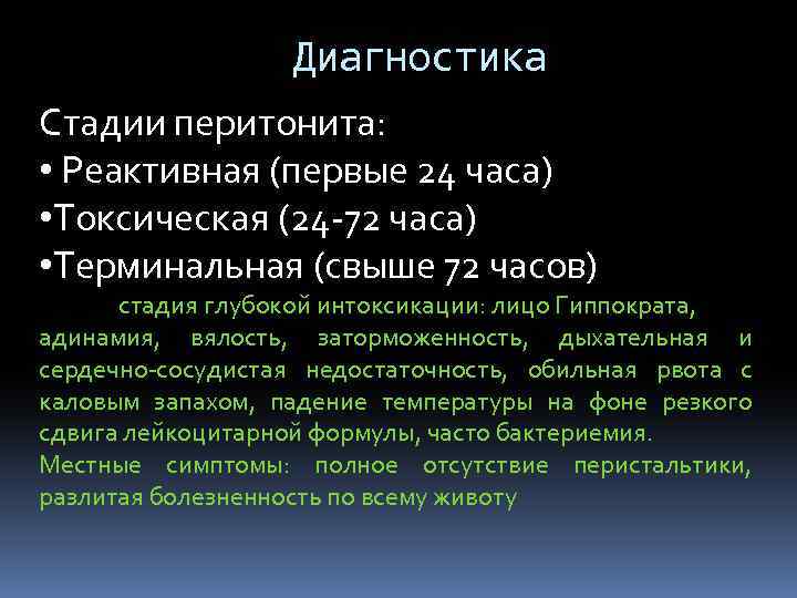 Диагностика Стадии перитонита: • Реактивная (первые 24 часа) • Токсическая (24 -72 часа) • Терминальная (свыше 72 часов) стадия глубокой интоксикации: лицо Гиппократа, адинамия, вялость, заторможенность, дыхательная и сердечно-сосудистая недостаточность, обильная рвота с каловым запахом, падение температуры на фоне резкого сдвига лейкоцитарной формулы, часто бактериемия. Местные симптомы: полное отсутствие перистальтики, разлитая болезненность по всему животу